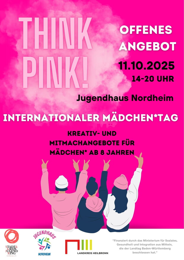 Der Aktionstag „THINK PINK“, der im Rahmen des internationalen Mädchentags jährlich am 11. Oktober begangen wird, geht in diesem Jahr in die neunte Auflage. Er findet jährlich wechselnd in einem der vielen Jugendhäuser im Landkreis Heilbronn statt. Mädchen und Mädchengruppen aus dem gesamten Landkreis werden erwartet, um gemeinsam einen unvergesslichen Tag zu erleben.