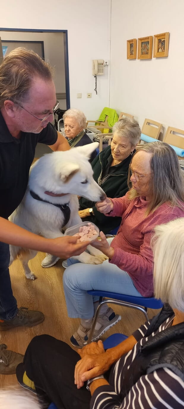 Die Ankündigung von 3 Therapiehunden an diesem verregneten Herbsttag machte sehr viele Bewohner neugierig. Im großen Stuhlkreis begrüßten sie die schwarz glänzende Labradorhündin Lotte, die mit ihrer stabilen Figur und ihren 8 Jahren eine bewundernswerte Darstellung bot. Alle waren mit einbezogen und erfreuten sich an dem schönen Tier. Lotte ist darauf ausgebildet, die geschossenen Enten der Jäger zu apportieren. Sie kommt aus der Gruppe der Gebrauchshunde und schwimmt sehr gerne. Ihrem Auftritt folgten zwei weiße Schäferhunde, Mutter Haley 4 Jahre und Tochter Beatrice 5 Monate alt. Die auch aus guter Zucht stammenden Schönheiten begeisterten nochmals alle Anwesenden und es war ein gelungener und bewegter Nachmittag. Herzlichen Dank an die beiden Züchter und unseren Förderverein, der uns hier finanziell wieder unterstützt hat.