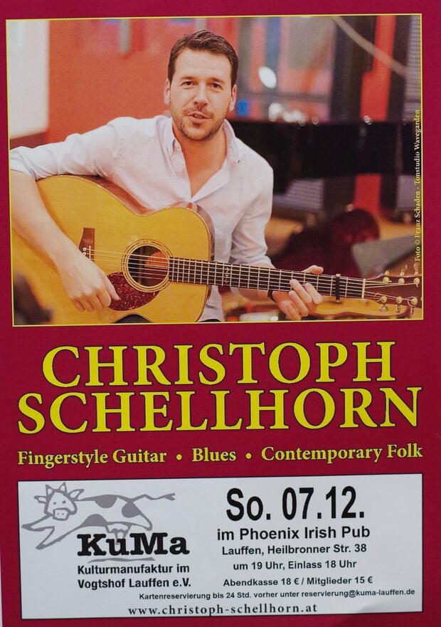 Am 7. Dezember ist der österreichische Gitarrenpoet Christoph Schellhorn zu Gast im Phoenix Irish Pub. Der exzellente Gitarrist präsentiert sich zugleich als Vollblutmusiker, Songwriter und humorvoller Entertainer.