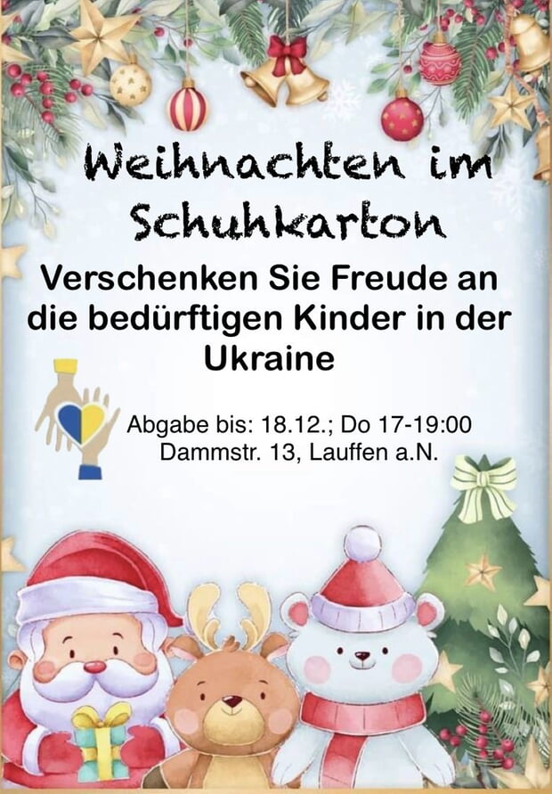 Schenken Sie Freude zu Weihnachten! Lassen Sie mit Ihrem Geschenk Kinderaugen leuchten. Die ukrainische Gemeinde in Lauffen startet die Aktion „Weihnachten im Schuhkarton" für bedürftige Kinder in der Ukraine.