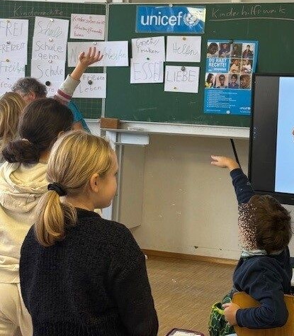 Herr Hötzel und Herr Leutz zeigten einen eindrucksvollen Film mit Kindern aus verschiedenen Ländern. So erklärten sie, warum Kinderrechte so wichtig sind – besonders dort, wo Kinder nicht zur Schule gehen können, arbeiten müssen oder keinen Zugang zu sauberem Wasser haben. Die Drittklässler durften viele Fragen stellen und erfuhren dadurch, wie UNICEF Kindern in schwierigen Situationen hilft.