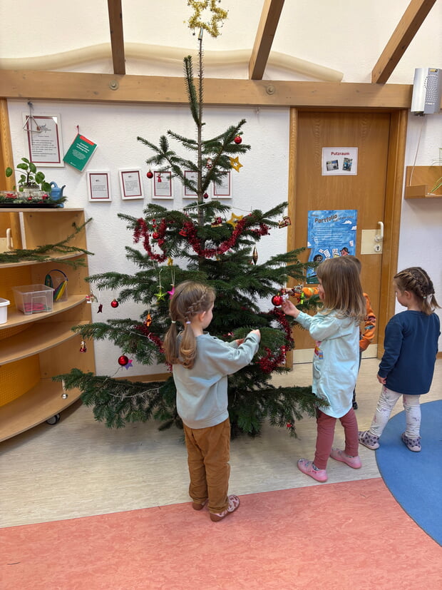 Ein geschmückter Kindergarten darf natürlich auch nicht fehlen. Mit Glitzer, bunten Papieren und Tannenzweigen wurden die Räume dekoriert und geschmückt. Besonders stolz sind die Kinder auf unseren Weihnachtsbaum. Auch durfte in diesem Jahr eine kleine Weihnachtswerkstatt einziehen. Was dort passiert, bleibt aber noch geheim! Soviel sei gesagt - mit Farbe, Glitzer und viel Kreativität wurde hier fleißig gewerkelt!