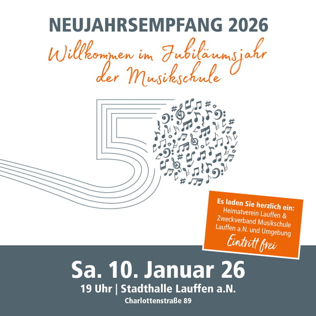 Gemeinsam mit dem Heimatverein Lauffen e. V. möchten wir Sie zum Start in unser Jubiläumsjahr am 10. Januar um 19 Uhr in die Stadthalle Lauffen einladen. Neben abwechslungsreichen musikalischen Darbietungen erwarten Sie unter anderem interessante Fakten zur Geschichte unseres Musikschulgebäudes, ein fotografischer Rückblick auf 50 Jahre Musikschule, kleine Überraschungen und selbstverständlich ein Getränk zum Anstoßen. Der Eintritt ist frei und wir freuen uns auf zahlreiche Gäste!