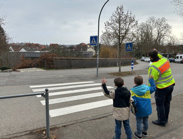 Große Aufregung herrschte bei den Erstklasskindern, denn sie bekamen Besuch von einer Polizistin und einem Polizisten. Die beiden erklärten den Kindern auf anschauliche Weise, wie wichtig es ist, sich sicher im Straßenverkehr zu bewegen. Nach kurzer Theorie ging es auch schon an die Praxis rund um die Herzog-Ulrich-Schule. Gemeinsam wurde das richtige Überqueren eines Zebrastreifens geübt. Außerdem sprachen die Polizistin und der Polizist mit den Kindern über aufmerksames Verhalten im Straßenverkehr, wie zum Beispiel beim Vorbeigehen an einer Einfahrt, denn dort könnte ein Auto herausfahren. Auch das Überqueren einer Kreuzung übte jedes Kind.