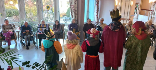 Auf den Besuch der diesjährigen Sternsinger, verkleidet als die heiligen drei Könige, waren unsere Bewohner an diesem frühen Januarmorgen gespannt. Mit Sternsingerliedern- und Sprüchen erfreuten uns die Kinder und segneten unser Haus. Sie sammelten für das Entwicklungsprojekt „…gegen Kinderarbeit, Schule statt Fabrik,“ in Bangladesch. Seit Mitte des 20. Jhd. gibt es diesen Brauch wieder zentral gesteuert in Deutschland u das gesammelte Geld geht in Entwicklungshilfeprojekte, die Kindern weltweit in Not helfen. Ein schöner Einklang in das Neue 2026, in dem wir wieder gemeinsam positiv in die Zukunft schauen.