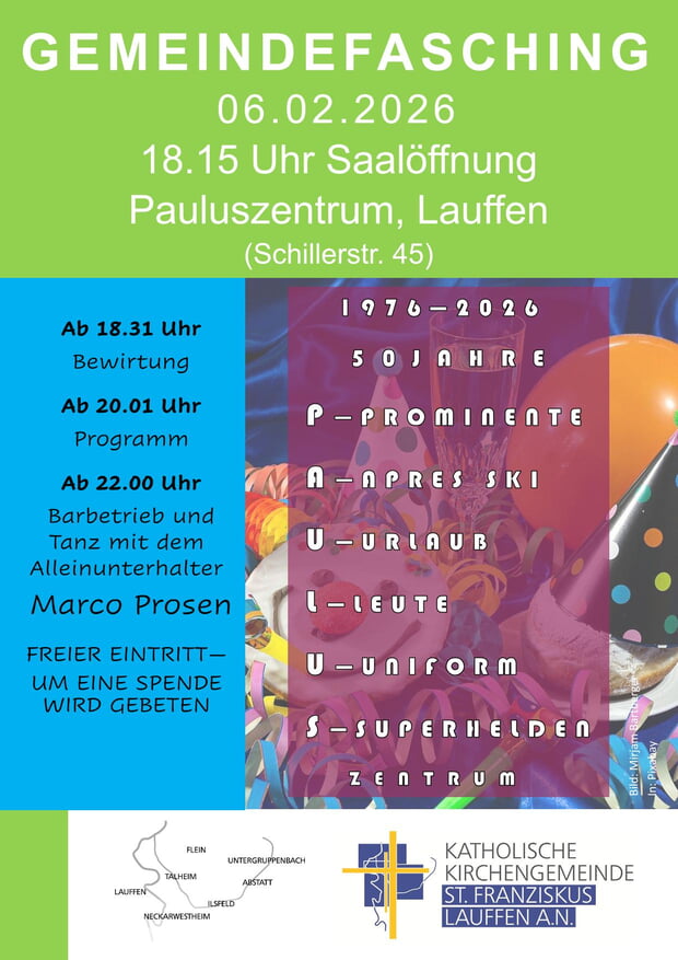 Nach dem tollen Programm und der sehr guten Stimmung letztes Jahr, wollen wir im Pauluszentrum in Lauffen auch in diesem Jahr wieder Fasching feiern.