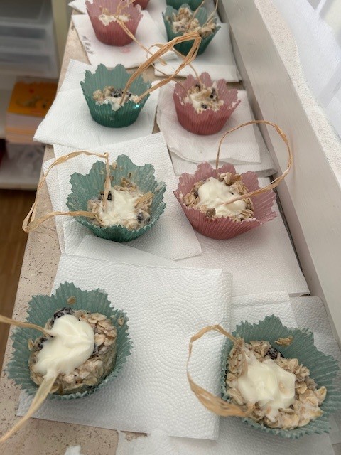 Das selbstgemachte Vogelfutter wurde anschließend in Förmchen gefüllt. Nach dem Abkühlen waren die Anhänger fest und bereit, zu Hause bei den Kindern aufgehängt zu werden. Ein paar der Anhänger wurden auch im Schulhof verteilt. Wir sind schon gespannt, welche Vögel wir dort bald beobachten können.