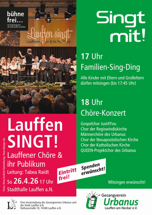 So. 26. April "Lauffen Singt" in der Stadthalle. Einlass: 16.30 Uhr, ab 17.00 Uhr Familien-singen bis 17.45 Uhr und ab 18.00 Uhr Konzert der Lauffener Chöre. Der Eintritt ist frei, um Spenden wird gebeten.