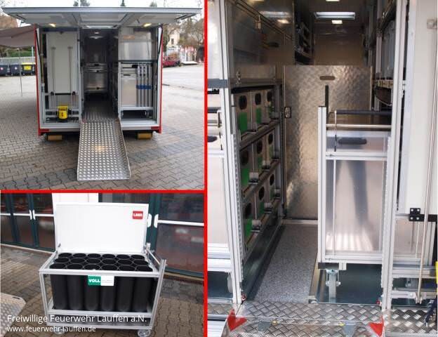 Die Firma GSF erhielt den Auftrag zum Bau des 6,90m langen, 2,50m breiten und 2,70m hohen Abrollbehälters. Der AB-AS wurde so konzeptioniert, dass er nicht nur dem reinen Materialtransport dient, sondern eine der wichtigsten Logistikkomponente für umfangreiche Atemschutzeinsätze darstellt.