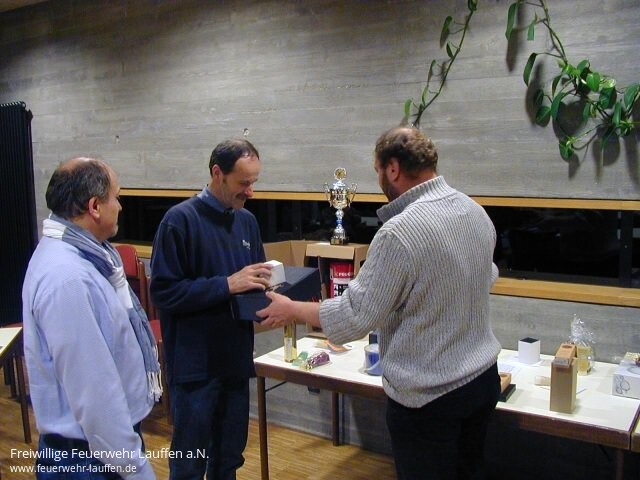 Nach zwei heißen Runden mit jeweils 15 Spielen, stand dann der Sieger des Binokelturniers fest. Neben dem Wanderpokal, konnte Kommandant Heiner Schiefer dem Gewinner Gerhard Wagner als als 1. Preis des Preisbinokel einen Feuerlöscher überreichen. Zweiter Sieger wurde Jürgen Stöcker und über den 3. Preis durfte sich Werner Eberhardt freuen.