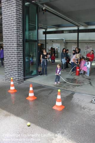 Um den teilweise noch recht jungen Kindern die Feuerwehr spielerisch näher zu bringen, wurden verschiedene Parcours und Stationen aufgebaut. Während die Eltern an der Kübelspritze ihre Fitness beweisen konnten, durften die Kinder je nach Leistung der Erwachsenen, einen Tennisball von den aufgestellten Pylonen herunterspritzen. Bei angenehmen Temperaturen verirrte sich aber auch mal ein Wasserstrahl in Richtung der Eltern oder der anderen Kindergartenkinder. Eine weitere Station galt es beim Hindernisparcours zu bewältigen. Musste hier doch mit einem mit Wasser gefüllten Plastikbecher über ein Steckleiterteil und einen ausgerollten B-Schlauch balanciert werden bevor es über einen Zick-Zack-Kurs wieder zurück zum Start ging. Besonders die Jüngsten zeigten hier bereits, wie hochkonzentriert sie diese Aufgabe mit ganz wenig Wasserverlust meistern konnten.