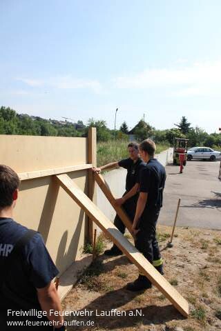 Technische Hilfeleistung bedeutet aber nicht nur Einsatz bei Verkehrunfällen. Das Abstützen von einsturzgefährdeten Wänden und Decken, sowie das Abdichten eines beschädigten Behältnis mit auslaufender Flüssigkeit, gehört ebenfalls in diesen Bereich. Auch hier konnten sich die Lehrgangsteilnehmer bei gefühlten 30° C an verschiedenen Stationen beweisen.