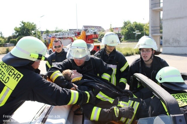 Wie bei fast allen Lehrgängen war erst einmal die trockene Theorie angesagt, bevor es dann an die praktische Umsetzung der vielseitigen Facetten der technischen Hilfeleistung ging. An vier bereitgestellten Kraftfahrzeugen galt es das Unterbauen eines Fahrzeuges, den Umgang mit hydraulischem Rettungsgerät und das Glasmanagement zu üben. Auch wurden diese Fahrzeuge zur patientengerechten Rettung benutzt. Hier stand das grobe Erkennen des Zustandes der verletzten Person, die Betreuung, das Anlegen der Halskrause (Stifneck) und des KED-System (Rettungskorsett) aber auch das Retten aus dem Fahrzeug mit dem Spineboard auf dem Programm.