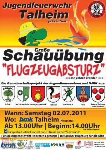 Unter der Regie der Jugendfeuerwehr Talheim laden die Jugendfeuerwehren aus Ilsfeld, Flein, Untergruppenbach, Neckarwestheim, Lauffen und Talheim, sowie das Jugendrotkreuz Unterheinriet am Samstag, 02.07.2011 ab 13 Uhr zu einer gemeinsamen Großübung "Flugzeugabsturz" auf das Gelände der bmk (Steinbruch am Rauhen Stich) ein. Die jungen Rettungskräfte werden bei dieser Großübung mit fast realen Einsatzbedingungen konfrontiert und müssen unter anderem auch echte Brände löschen. Wer sich also ein Bild von der Schlagkraft des künftigen Feuerwehr- und Rotkreuznachwuchs machen will, sollte diesen Termin nicht versäumen. Für die Verpfelgung ist gesorgt.