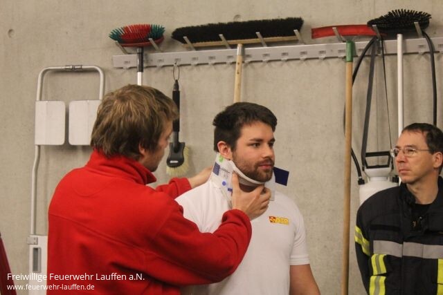 Wie eine Halskrause, ein sogenanntes Stifnek zur Immobilisierung der Halswirbelsäule angelegt oder wie ein Patient mit einer Schaufeltrage, bzw. mit einem Spineboard (Rettungsbrett) richtig und patientenschonend aufgenommen, bzw. umgelagert wird, war eine weitere Aufgabenstellung an diesem Abend.