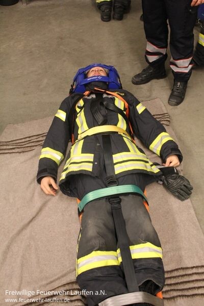 An der Drehleiter zeigte sich, dass es verschiedene Arten von Krankentragen gibt, die auch an der Krankentragehalterung am Korb unterschiedlich zu sichern sind. Mit einem rund 80 Kg schweren Dummy wurde dann das Vorgehen mit dem Trageteil der Krankenfahrtrage aus dem RTW, der Schleifkorbtrage aus dem Rüstwagen und einer Krankenklapptrage praktisch geübt.