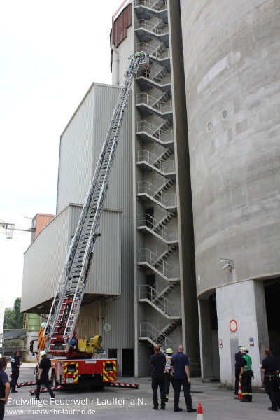 Der Lehrgangsstoff den Ausbilder Thöne mit hervorragendem methodischem und didaktischem Können an die örtlichen Multiplikatoren vermittelte, beinhaltete unter anderem die Theorieteile Übungsvor – und Nachbereitung, das Aufstellen und der Einsatz von Hubrettungsfahrzeugen nach der Hindernisse Abstände Untergrund Sicherheit-Regel und die Vermittlung von Fachthemen an die örtlichen Drehleitermaschinisten. Praktisch waren die Teilnehmer mit dem Abhalten von Lehrproben aber auch mit den Einsatzmöglichkeiten der Lauffener Drehleiter an verschiedenen Lauffener Bauwerken, wie z.B an den Silotürmen der Firma Märker Zement und anderen Gebäuden gefordert.