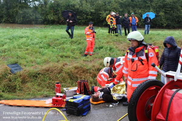 Hydraulische Geräte wie Scheren, Spreizer oder Zylinder setzt die Feuerwehr zur Bergung der Personen (Statisten und Dummys) aus den stark beschädigten Fahrzeugen ein. Die bestens ausgebildeten Frauen und Männer der Hilfsorganisationen verstehen ihr Handwerk. Stück für Stück zerlegen sie die Autos, um an die Verunglückten heranzukommen. Auch die DRK-Mannschaft leistet Vorbildliches. Verletzte werden auf eine höhenverstellbare Trage gelegt, teilweise künstlich beatmet, an einen Infusionstropf angeschlossen und nach der Erstversorgung in den Schockraum gebracht.