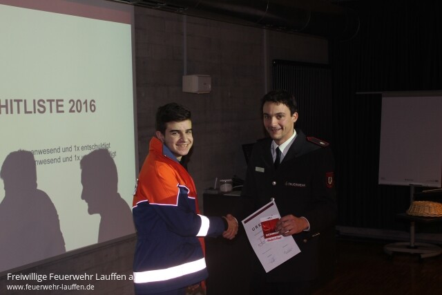 Eine Urkunde und einen Gutschein überreicht Timo Kraft an Florian Petrovic, welcher im Berichtsjahr mit den meisten Teilnahmen an den Übungsterminen glänzen konnte.