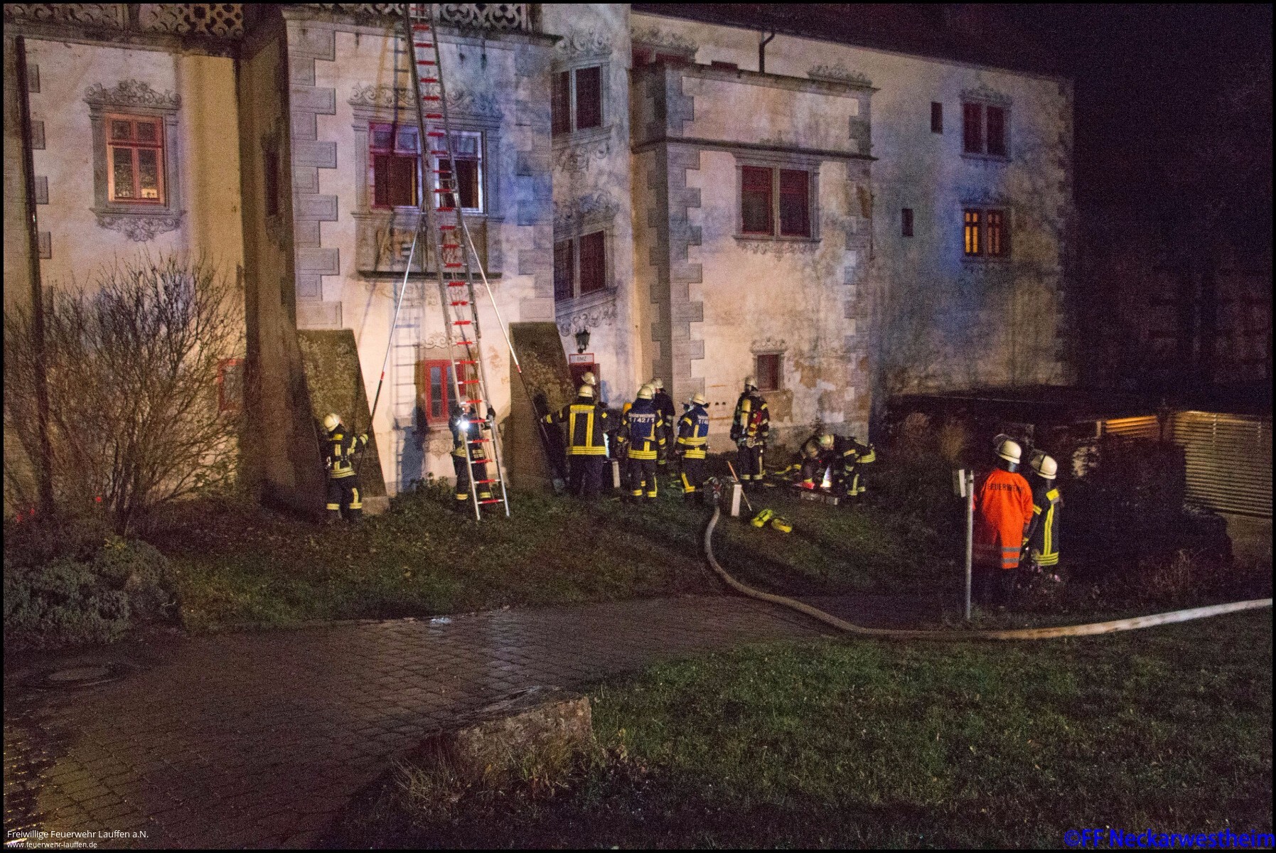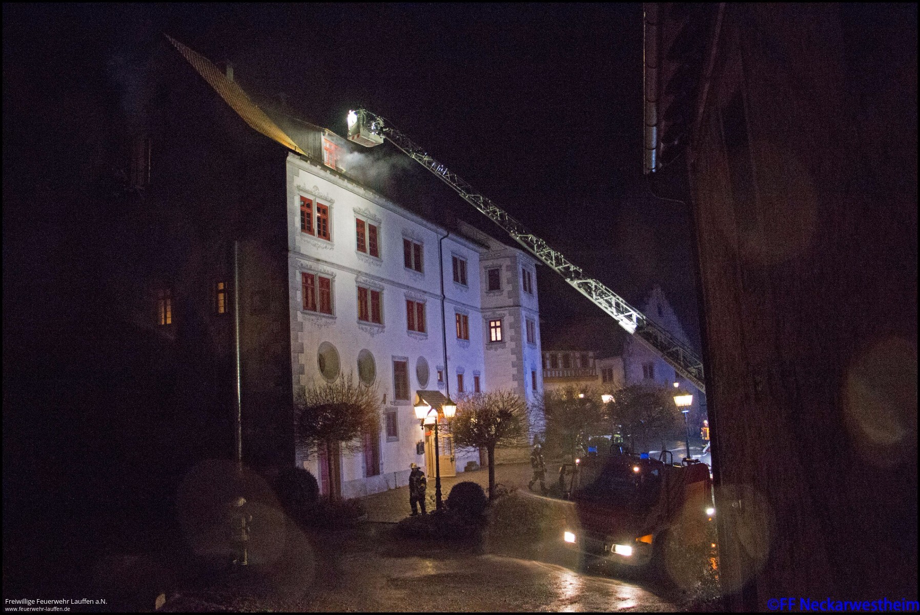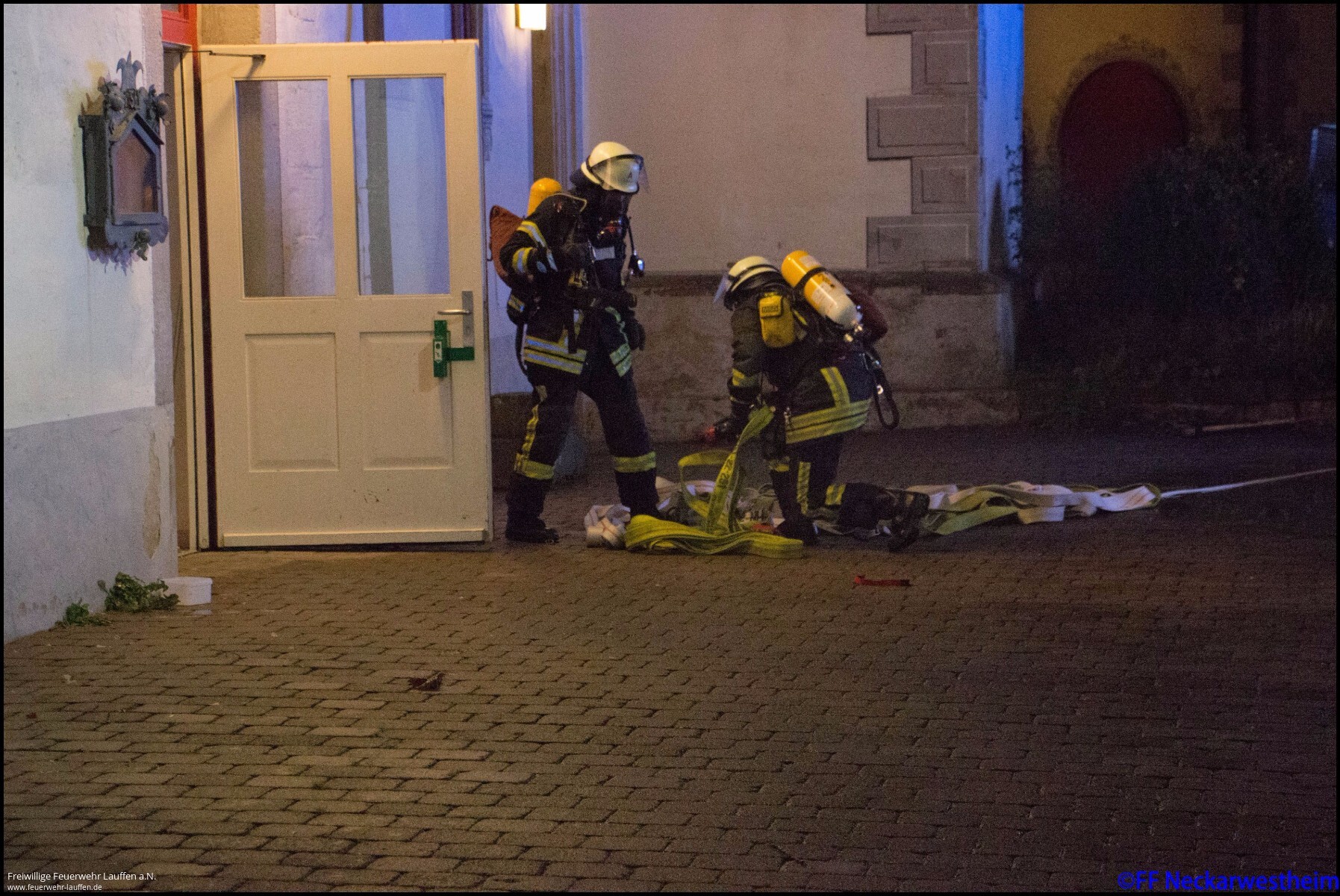 In der Zwischenzeit ist auch die Feuerwehr Lauffen eingetroffen. Sie übernimmt den Einsatzabschnitt im Innenhof. Die Drehleiter wird aufgestellt und beginnt mit der Personenrettung von den Dachgauben. Weitere Trupps gehen unter Atemschutz zur Brandbekämpfung ins Gebäude vor. Eine Person wird mit einer Fluchthaube nach draußen gebracht.
