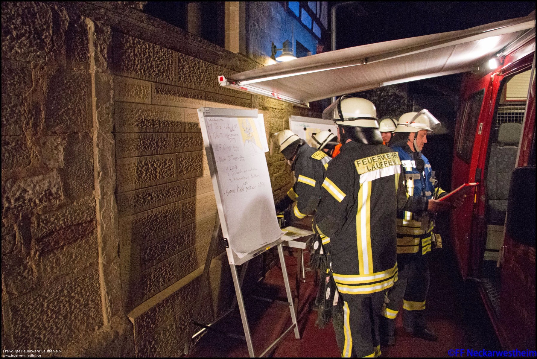 Um die Übung realistisch darzustellen, wurde das Hotel mit 2 Nebelgeneratoren, wie man sie aus Diskos kennt, vernebelt. Die Brandmeldeanlage löste aus und alarmierte die Feuerwehren aus Neckarwestheim und Lauffen. Als erstes Löschfahrzeug kommt das HLF 20 aus Neckarwestheim an der Einsatzstelle an. Vom Balkon rufen „Hotelgäste“ um Hilfe. Sie sind auf dem Balkon nicht in Gefahr, aber es ist kalt und regnerisch. Ein Feuerwehrangehöriger beruhigt die Gäste von unten. Währenddessen verschafft sich ein Trupp unter Atemschutz Zugang zum Treppenhaus. Ein weiterer Trupp geht zur Brandmeldeanlage und sucht den Rauchmelder, der den Alarm ausgelöst hat.