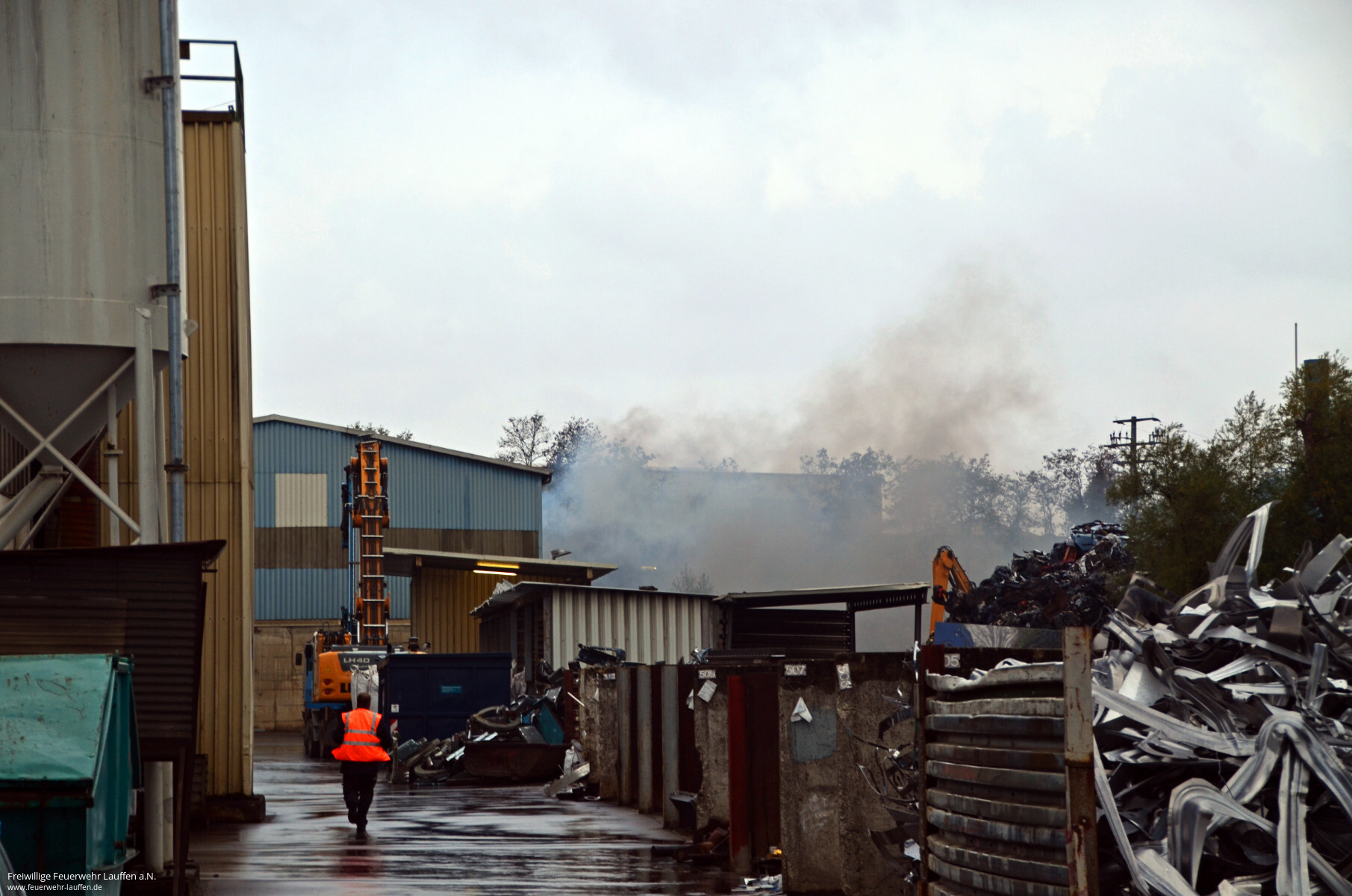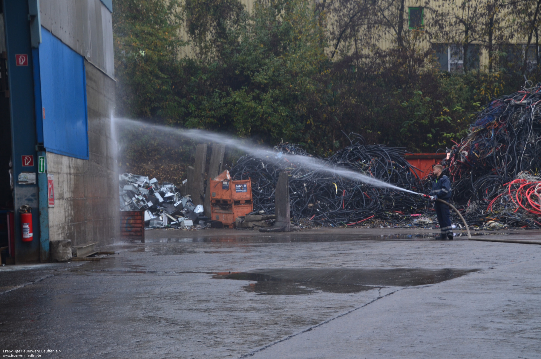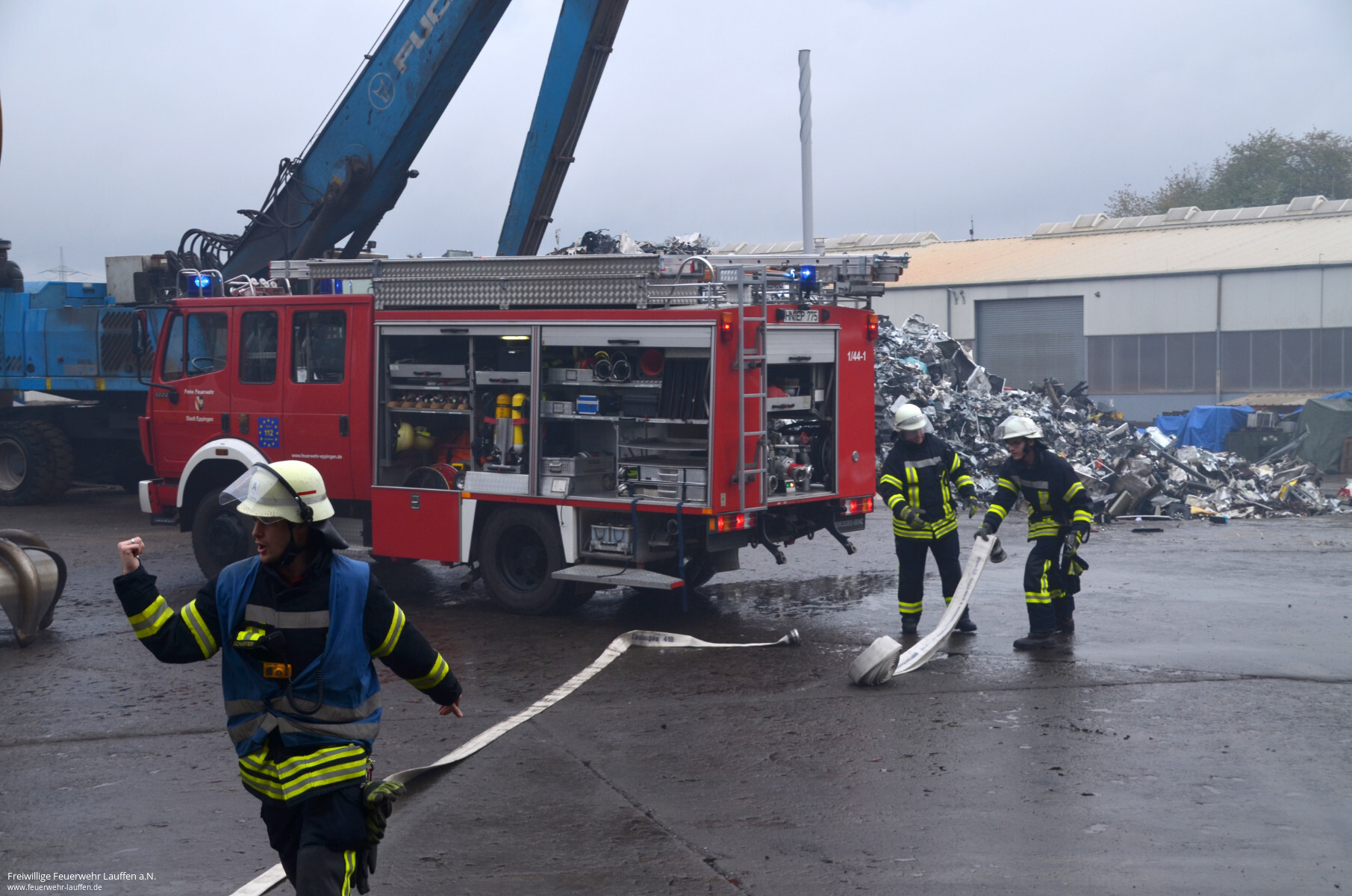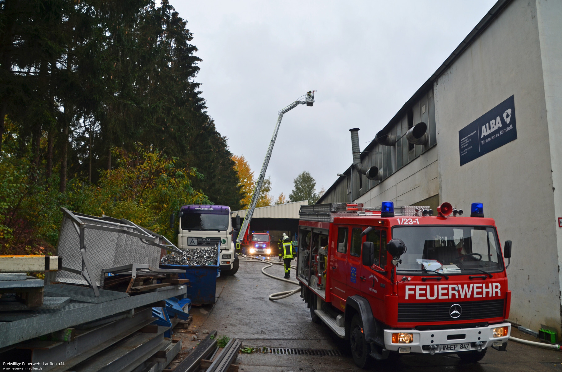 Die interne Löschgruppe der Fa. ALBA leitet erste Maßnahmen ein, bekommt das Feuer aber nicht in Griff. Daraufhin wird über 112 die Feuerwehr alarmiert.