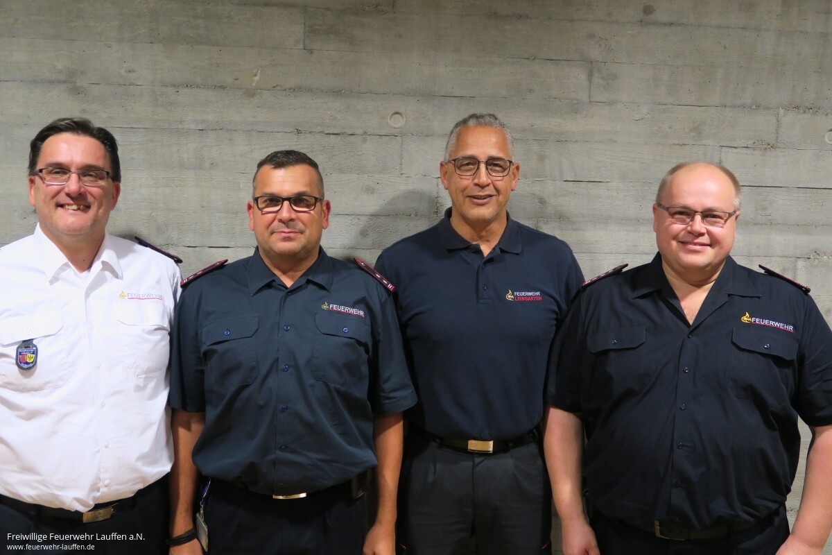 Bild: v.l. stellv. KFV-Vorsitzender Martin Kuhmann, Peter Hügle (FW Brackenheim), Andrè Göbl (FW Leingarten) und Jörg Schellenbauer (FW Cleebronn). Auf dem Bild fehlt Heiner Schiefer (FW Lauffen a.N.) wegen Abwesenheit in Frankreich.