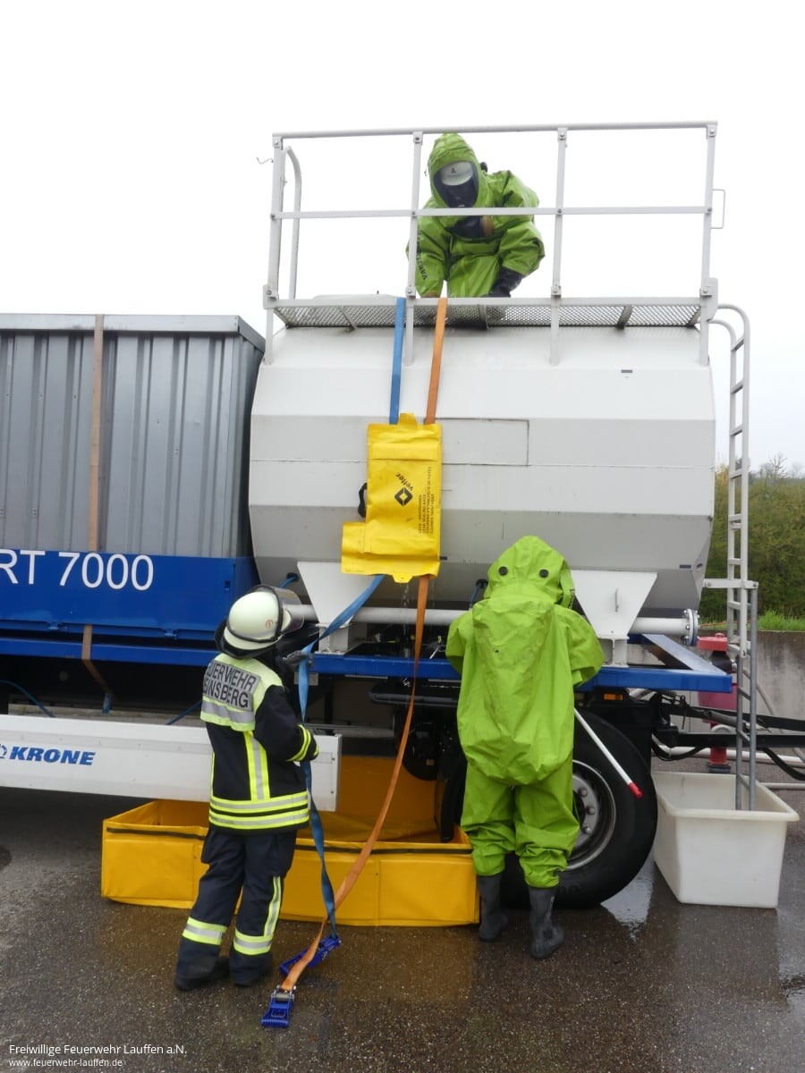 Den Stoff erkennen, die richtigen Meßgeräte zu verwenden aber auch das Ankleiden mit den Chemikalienschutzanzügen, die Dekontamination der Einsatzkräfte und das richtige Auskleiden wurden eingehend geübt. Das Abdichten eines leckgeschlagenen Tanks konnte mit unterschiedlichen Hilfsmitteln an einem speziellen Übungsanhänger durchgeführt werden.