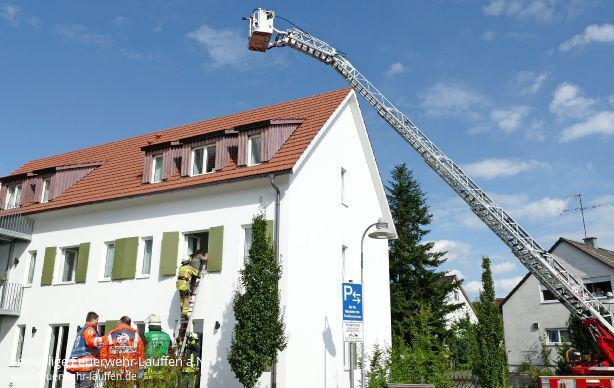 Manchmal handelt es sich aber auch nur um eine Übung – wie am Samstagnachmittag um die öffentliche Jahreshauptübung der Freiwilligen Feuerwehr Lauffen. Viele Schaulustige beobachten das Geschehen in der Lange Straße. In der Wohn- und Pflegeeinrichtung der Stiftung Lichtenstern ist ein Brand ausgebrochen, und einige Bewohner können sich nicht selbst aus dem brennenden Haus retten.