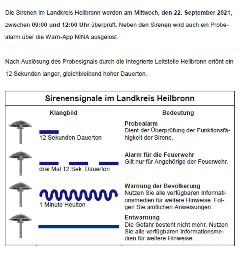 Um die Bevölkerung neben den mobilen WarnApps, wie z.B. NINA, KatWarn, etc. bei Großschadenslagen schnell und ausreichend warnen zu können, werden im Landkreis Heilbronn auf Gemeindeebene Sirenen vorgehalten. Um die Funktionsfähigkeit der Sirenen sicherzustellen, finden in regelmäßigen Abständen Überprüfungen der Sirenenanlagen mit einem Probealarm statt.