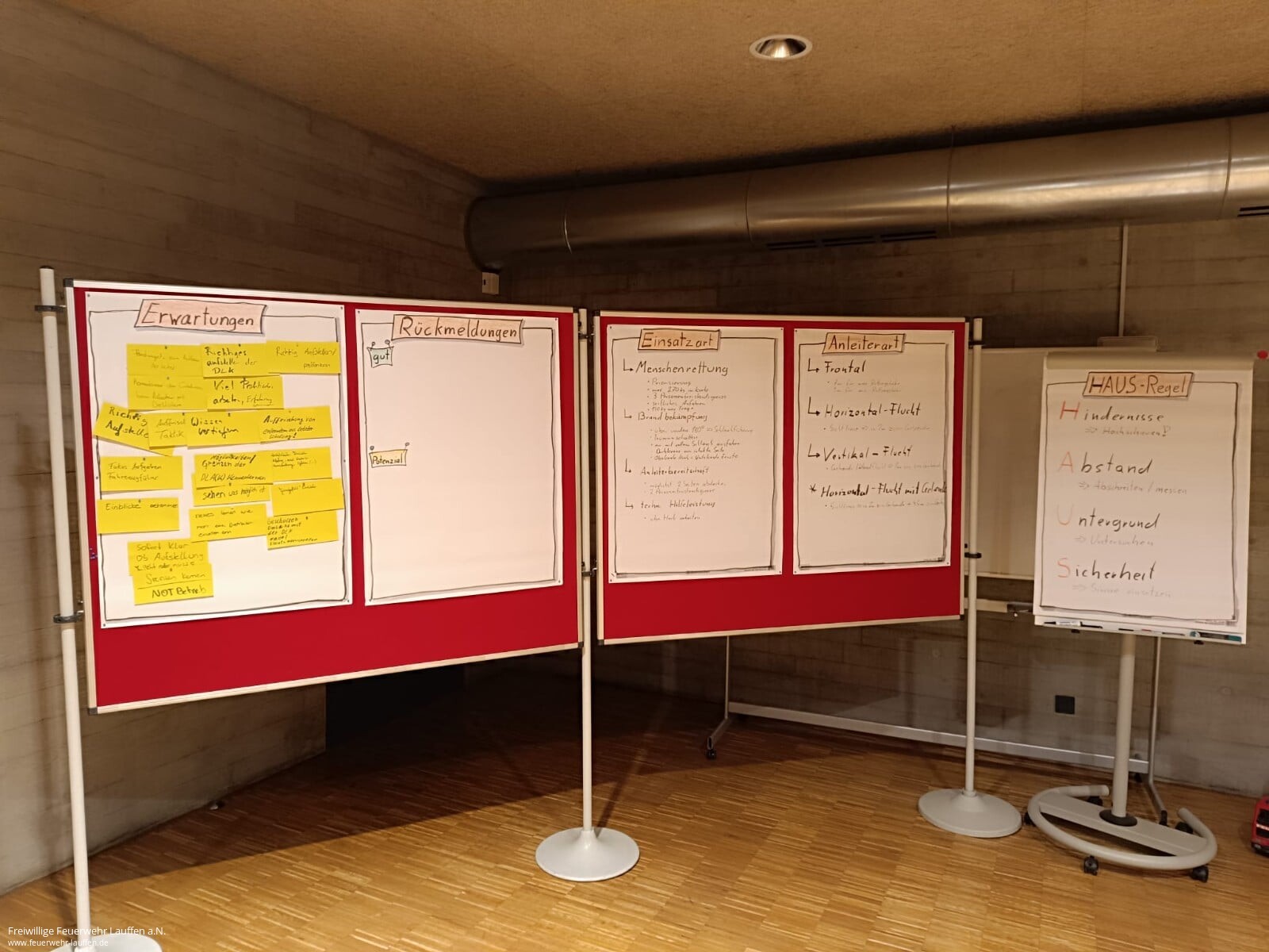 Nachdem jeder Teilnehmer zunächst seine Erwartungen an die Aus- und Fortbildung auf einen Zettel notiert hatte und an der Pinnwand dazu kurz etwas sagte, stieg man direkt ins Thema ein. Zunächst wurden die Einsatzarten, welche mit einer Drehleiter bewältigt werden können, erläutert. Diese gliedern sich in Brandbekämpfung, Menschenrettung, Anleiterbereitschaft und Technische Hilfeleistung. Im zweiten Teil wurden die Anleiterarten durchgesprochen, möglich sind hier frontal, Horizontal-Flucht, Vertikal-Flucht sowie im Fall der Lauffener Drehleiter beispielsweise auch Horizontal-Flucht mit Gelenk. Abschließend war noch die bereits erwähnte Haus-Regel Thema.