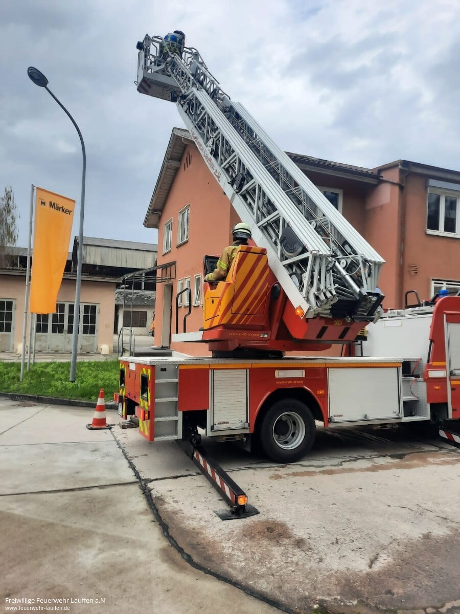 Neben dem Theorie-Teil am Freitagabend stand der Samstag im Zeichen der praktischen Ausbildung. Nach der Begrüßung ging es direkt an das Vermessen der Drehleiter. Hier gilt es sich einige Abmessungen zu merken, um am Einsatzort beurteilen zu können, ob ein Drehleitereinsatz an der vorgesehenen Stelle bei der benötigten Einsatzart möglich ist. Anschließend fuhr man auf das Werksgelände der Firma Märker Zement. Hier hatte man beste Übungsvoraussetzungen. Es wurden mehrere Anleiterübungen mit wechselnder Fahrzeugbesatzung durchgeführt und durch die anderen Teilnehmer beobachtet und bewertet. Nach jeder Übung fand eine kurze Nachbesprechung statt.