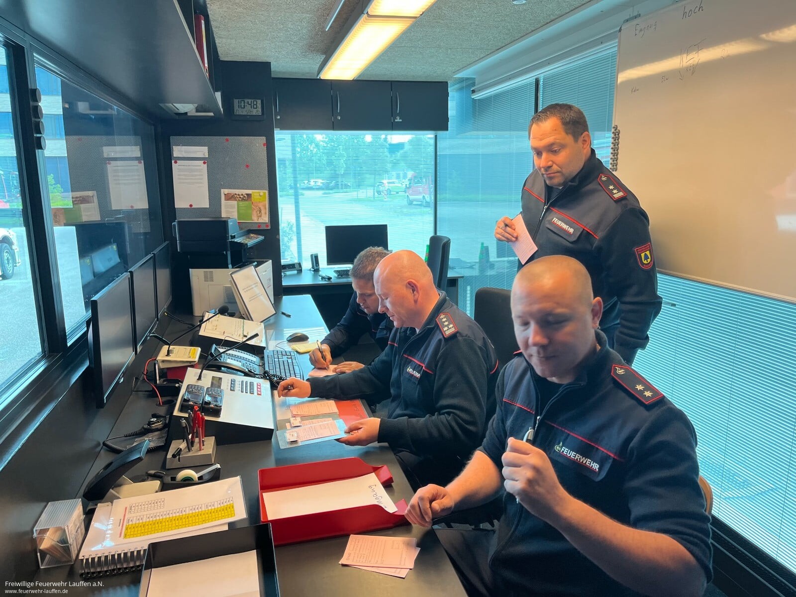 In praktischen Übungen wurde dann eine Unwetterlage mit einer Vielzahl von Einsätzen simuliert, die von einer Führungsgruppe im Führungshaus (Fernmeldebereich und Führungsraum) abgearbeitet werden musste. Durch die Einbindung der Fernmeldegruppe mit ELW 2 des Landkreises, welche die Einsätze über verschiedene Medien einspielte und auch die Rolle der eingesetzten Einsatzfahrzeuge übernahm, konnte dabei eine sehr realitätsnahe Übungssituation erreicht werden.