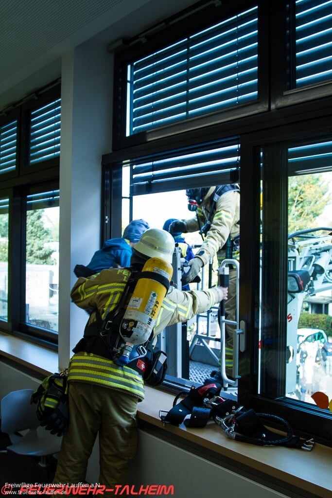 Durch den Einsatzleiter informiert bekommen die Kameraden aus Lauffen wichtige Informationen zum Einsatzgeschehen. Die Leiter fährt aus und der Maschinist im Leiter Korb fährt an ein Fenster im ersten Obergeschoss der Ostseite, dahinter eine Schulklasse, die durch Winken und Rufen auf sich aufmerksam macht. Stück für Stück wird ein Kind um das andere über die Drehleiter in Sicherheit gebracht.