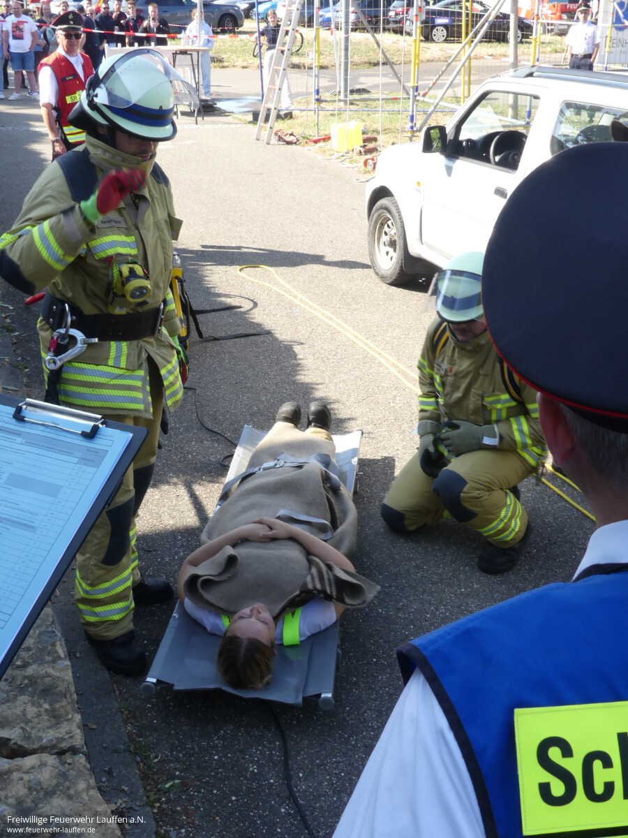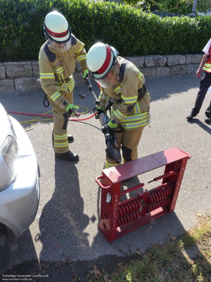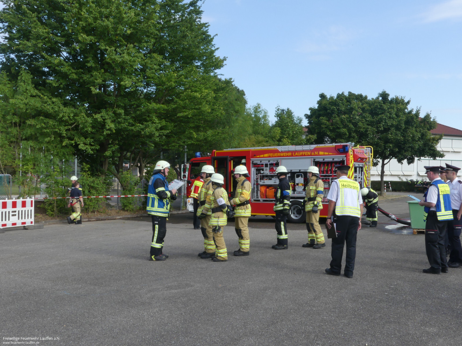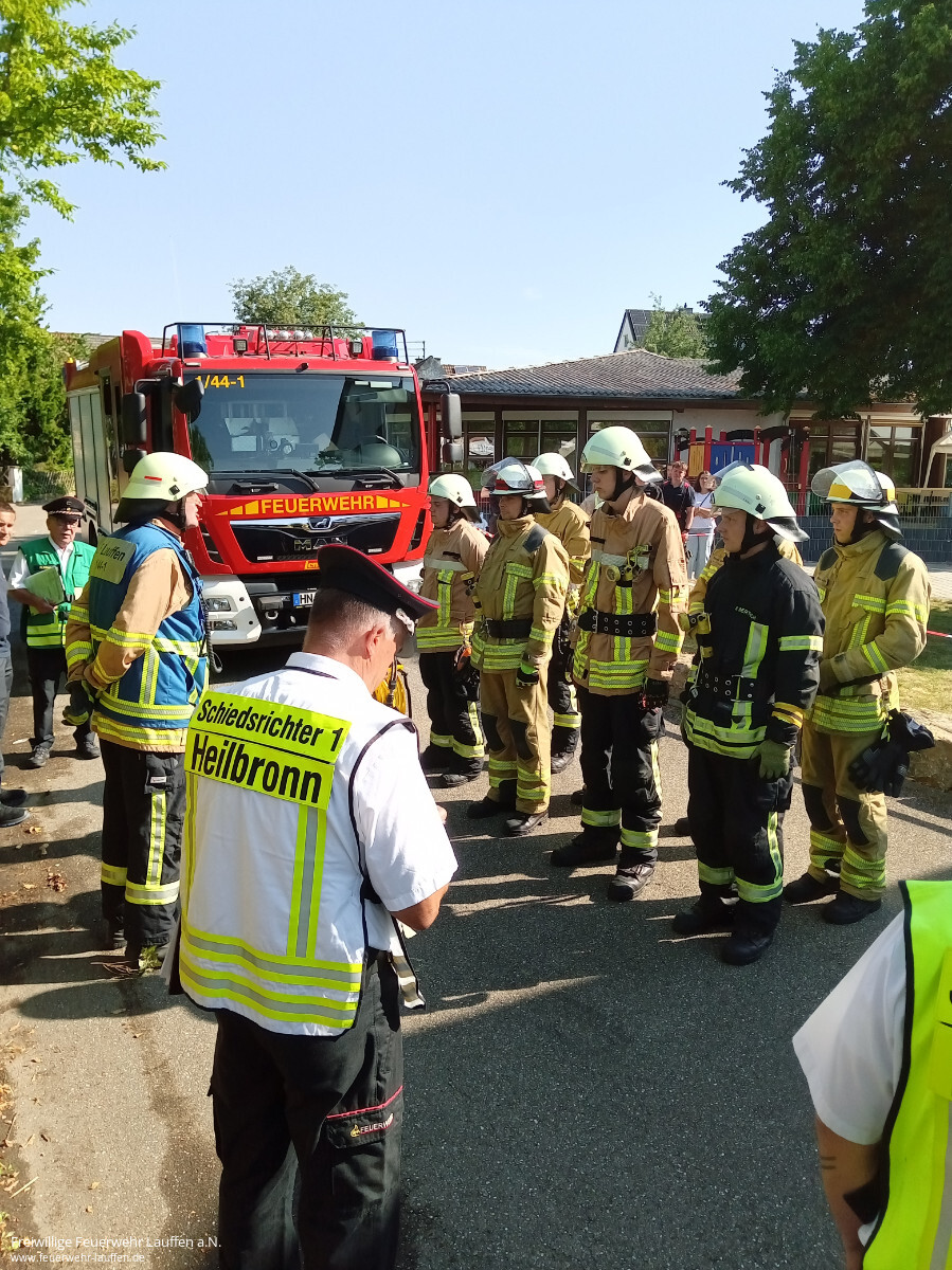 Die gemischten Gruppen von Feuerwehrleuten aus Talheim (Maximilian Seibert, Robert Bertsch, Ben Schüchtle, Sven Manske, Leon Bender, Jochen Henn) und Lauffen (Ralph Kindermann, Thomas Wächter, Simon Link, Stina Winter, Tim Hemmerlein, Viola Eberbach, Benedict Betz, Paul Röckel, Florian Werner), traten zur Abnahme des Leistungsabzeichens in Silber an. Die Prüfung verlangte den Teilnehmenden alles ab: Ein Löscheinsatz unter Atemschutz mit Wasserentnahme aus offenem Gewässer, sowie eine technische Hilfeleistung nach Verkehrsunfall mit Personenrettung, mussten unter Zeitdruck und mit höchster Präzision durchgeführt werden.