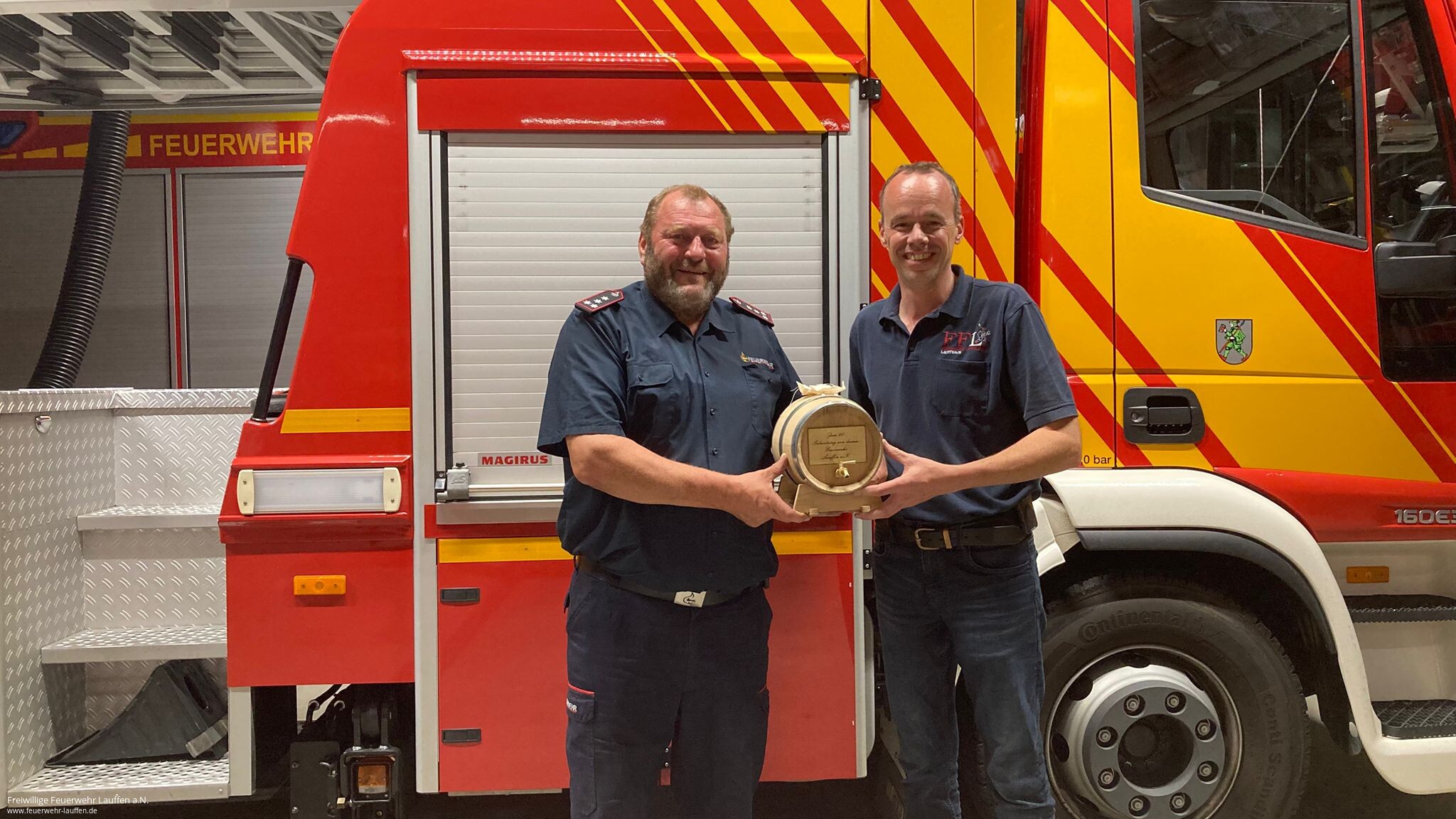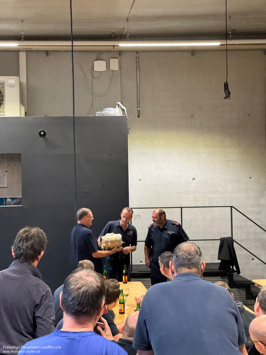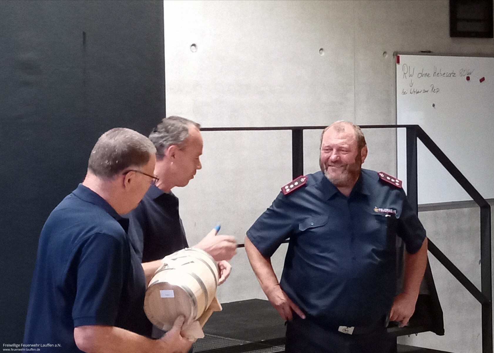 Am Montagabend 28. Juli lud Heiner Schiefer dann nach der Gesamtübung neben den Feuerwehrmitgliedern auch einige Gäste aus dem Feuerwehrwesen zu einem gemütlichen Beisammensein im Feuerwehrhaus ein, hier wurde ihm das Geschenk seiner Feuerwehr Lauffen übergeben.