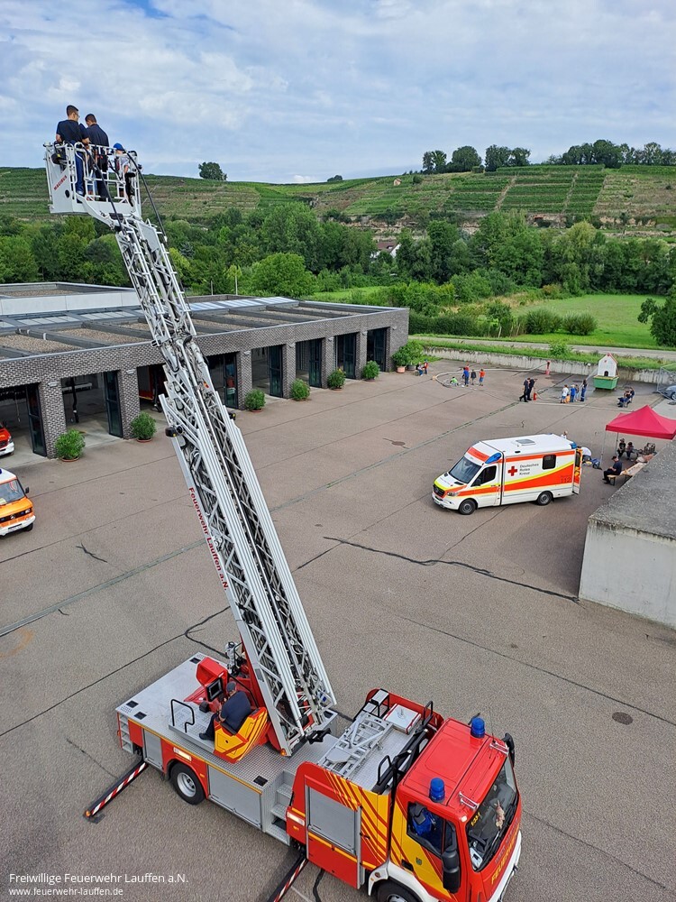 An verschiedenen Stationen konnten die Kinder das brennende Holzhaus beim Spritzenspiel löschen oder mit der Drehleiter hoch hinausfahren. Bei der Station des DRK Ortsverein Lauffen hatten alle Kinder die Möglichkeit einen Rettungswagen zu besichtigen. Zur Stärkung konnten sich die Kinder bei einer Brezel und Apfelschorle in der großen Fahrzeughalle ausruhen. Für viele strahlende Gesichter sorgten die Highlights wie die Fahrt mit dem Feuerwehrauto und die Fahrt mit dem Feuerwehrboot auf dem Neckar.