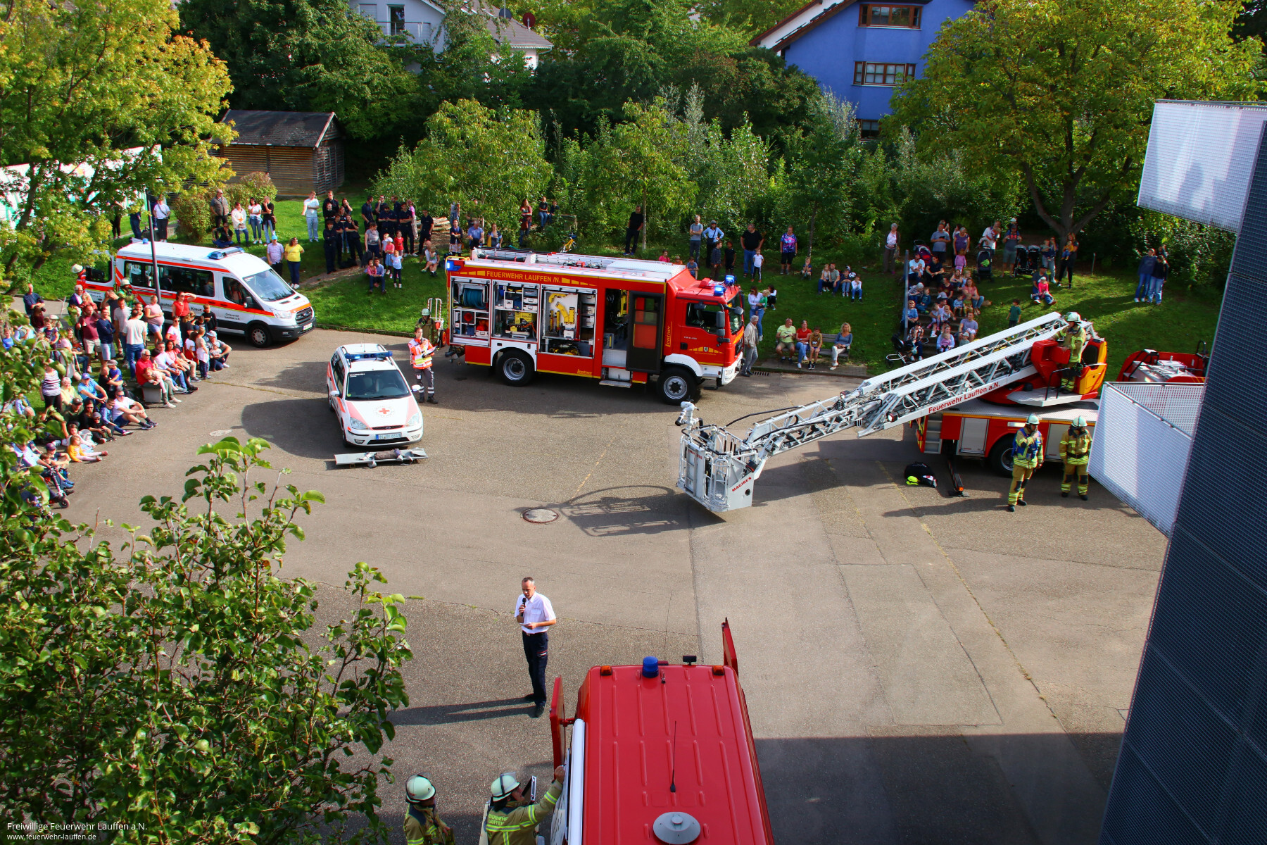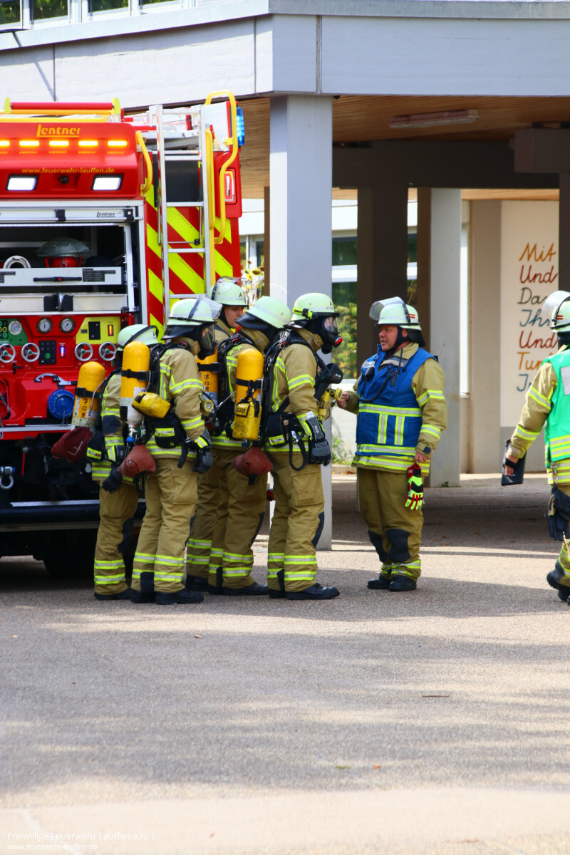 Der Schulstandort an der Charlottenstraße wird im September 50 Jahre alt, aus diesem Anlass war das Gymnasium Schauplatz unserer diesjährigen Jahreshauptübung. An dieser Übung hatte die interessierte Lauffener Bevölkerung die Möglichkeit sich einen Einblick von der Leistungsfähigkeit unserer Wehr sowie dem DRK Ortsverein zu verschaffen. Am 13. September lösten pünktlich um 16 Uhr die Funkmeldeempfänger der Feuerwehrangehörigen mit dem Stichwort „Gas 3 Feuer Übung mit Rauch Hölderlin Gymnasium, Lauffen, Charlottenstraße 87“ aus.