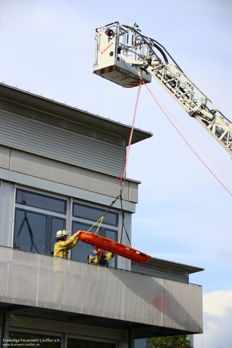 Im zweiten Teil der Übung kam die Fachgruppe ERHT (einfache Rettung aus Höhen und Tiefen) mit der Drehleiter und dem Rüstwagen zum Einsatz, der verunglückte Gebäudereiniger wurde durch die Helfer des DRK erstversorgt und schonend mittels der Schleifkorbtrage über einen Flaschenzug aus dem 2. OG gerettet.