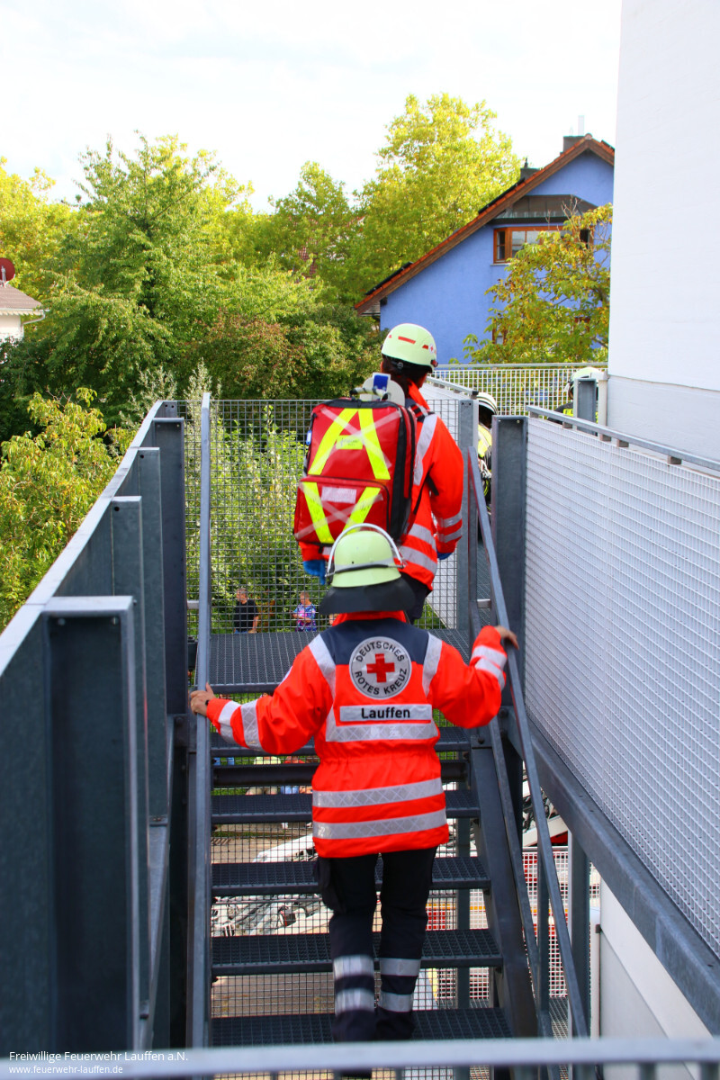Angenommene Lage war ein Brand im zweiten Obergeschoss mit sechs betroffenen Personen. Dazu kam ein verunglückter Mitarbeiter einer Gebäudereinigungsfirma, welcher gerade auf einem der Fluchtbalkone dabei war die Fenster zu putzen. Durch den ausgelösten Alarm hatte dieser sich derart erschrocken, dass er von der Leiter gestürzt war.