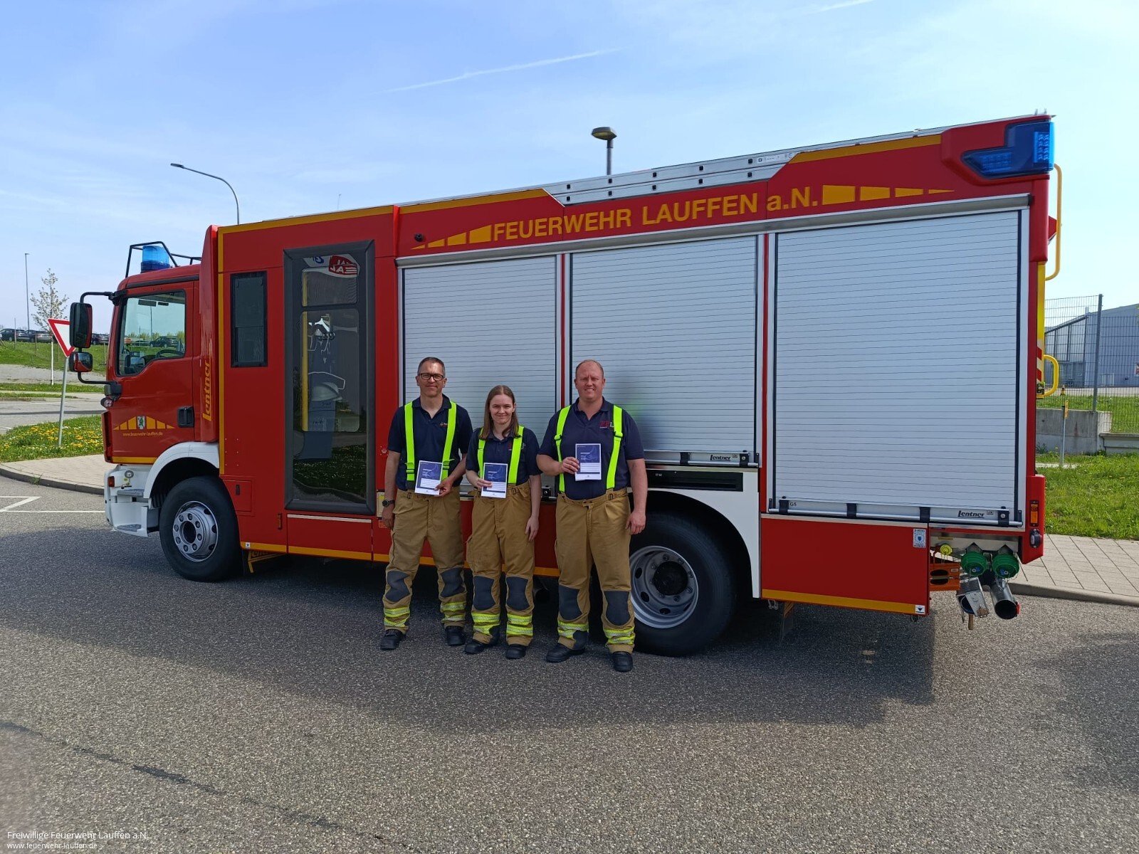 Nach erfolgreicher Teilnahme durften unsere Lauffener Teilnehmerin Viola Eberbach und die Teilnehmer Thomas Rembold und Kevin Wagner das Abzeichen „Geschicklichkeitsprüfung für Maschinisten der Feuerwehr Baden-Württemberg“ entgegennehmen. Ebenso gab es den passenden Eintrag in das Besitzzeugnis dazu.