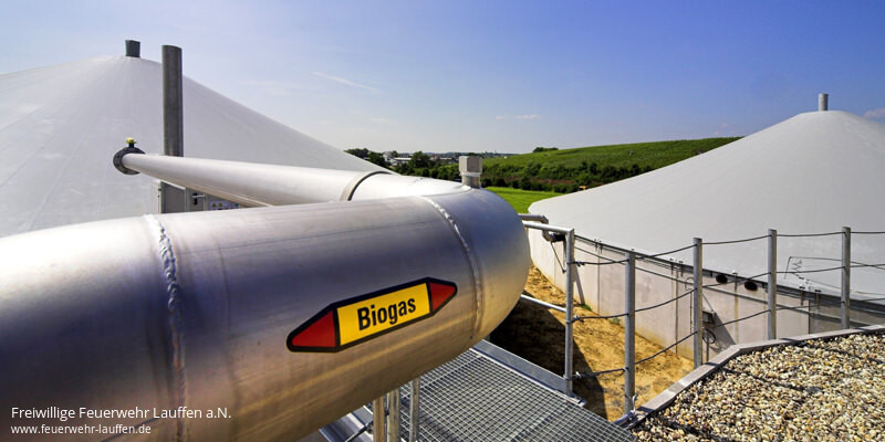 In der Biogasanlage wird in einem mehrwöchigen Fermentier-, und Gärprozess aus Silage Biogas erzeugt. Dieses wird in den Fermentern gespeichert und gelangt bei Bedarf an das Blockheizkraftwerk wo aus dem Biogas Strom und Wärme gewonnen wird. Der Strom wird eingespeist und die Wärme wird der nahe gelegenen Fa. Walter Söhner geliefert, die dort je nach Bedarf als Heizwärme genutzt oder in Kälte umgewandelt wird. Biogas ist ein Gasgemisch aus ca. 50 – 80 % Methan, 20 – 50 % Kohlenstoff, sowie kleine Anteile aus Stickstoff, Wasserstoff, Sauerstoff und Schwefelwasserstoff. Im Falle eines Freisetzens entmischt sich dieses Gasgemisch, wobei das Methan nach oben steigt da es leichter als Luft ist, während der enthaltende Anteil CO2 nach unten absinkt. Bedingt durch den Schwefelwasserstoff, riecht es nach „faulen Eiern“. Bei der Stromgewinnung im Blockheizkraftwerk kommt des weiteren noch die Gefahr der Elektrizität hinzu.