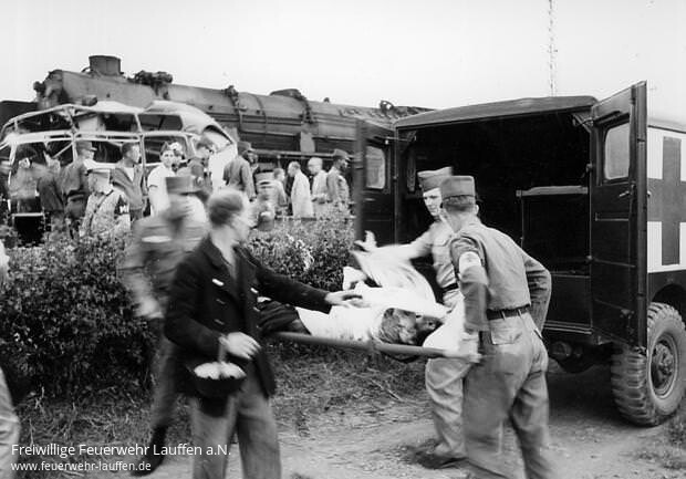 Den herbeistürzenden Lauffenern und den wenig später eintreffenden Rettungskräften - Polizei, Feuerwehr, Rotes Kreuz, der Sanitätszug der in Heilbronn stationierten US-Soldaten - bietet sich ein schreckliches Bild. Überall liegen tote Menschen. Vom Bus ist nur noch ein demolierter Blechhaufen übrig geblieben. Verletzte schreien.