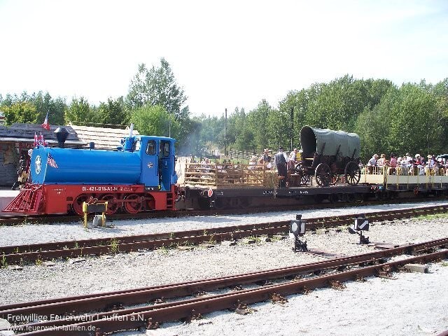 Bevor man bei der Feuerwehr feierte, stand der Samstag beim Besuch der 11. Westerntage in Haselbach ganz im Zeichen des Wilden Westens. Am Rand der Kohlebahnstrecke zwischen Meuselwitz und Regis-Breitingen hatte man keine Mühen gescheut um die Besucher in diese Zeit zurückzuversetzen. Nach vielen Vorführungen und gesammelten Eindrücken in der Westernstadt galt die Fahrt mit der Kohlebahn als Höhepunkt. Da die Bahnstrecke eingleisig verläuft wartete an den Ausweichstellen vom Zugüberfall bis zur Line Dance Gruppe noch so manche Attraktion auf die Fahrgäste.