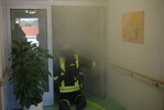 Atemschutz Schnell macht sich Einsatzleiter Roland Gräsle ein Bild von der Situation: Im linken Flügel, in dem künftig Wachkomapatienten untergebracht sein werden, ist das fiktive Feuer ausgebrochen. Elf "verletzte" Personen befinden sich im Haus. Dicker Rauch aus der Nebelmaschine versperrt den Fluchtweg. Rasch sind die Schläuche durchs Treppenhaus nach oben verlegt. Atemschutzgeräteträger suchen die verrauchten Flure ab.