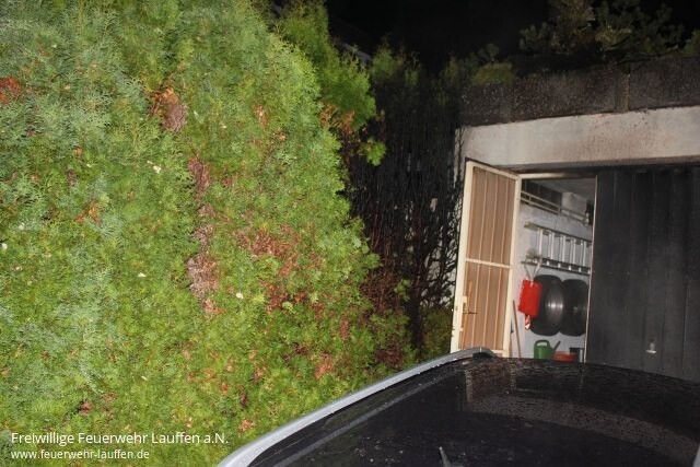 Da der Motorraum des Pkw bereits in Vollbrand stand, wurde von einem Trupp unter Atemschutz mit dem Schnellangriff die Brandbekämpfung am Garagentor und der Thujahecke vorgenommen, um so eine Ausbreitung des Brandes auf das Wohngebäude, bzw. das Nachbarhaus zu verhindern. Durch einen zweiten Trupp wurde dann die Brandbekäpfung am brennenden Kfz eingeleitet und dieses abgelöscht. Weil die Garage im Haus integriert ist, kam es zusätzlich noch zu einer geringen Ausbreitung von Brandrauch im Gebäude, welches mit einem Überdrucklüfter rauchfrei gemacht wurde. Vorsorglich wurden die betreffenden Räumlichkeiten noch mit der Wärmebildkamera kontrolliert.