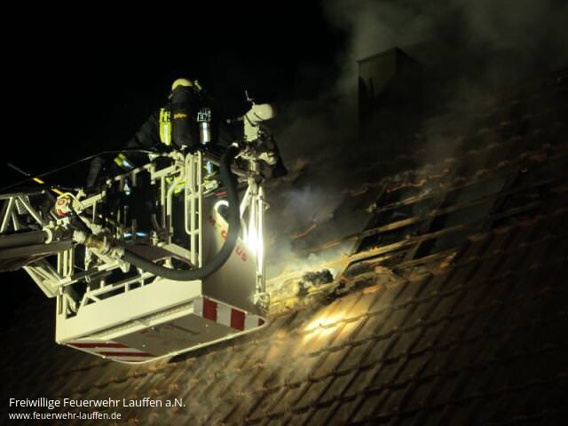 Gemeinsam mit den Einsatzkräften aus Lauffen konnte dann das Ziegeldach geöffnet und zahlreiche Glutnester abgelöscht werden.