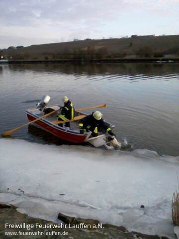 Beim Eintreffen der Feuerwehr versuchte der Hund sich auf die Eisflächezu retten, was diesem aber nicht gelang. Mit dem neuen Rettungsboot konnte der Hund dann mit etwas Widerstand aufgenommen und wohlbehalten an Land gebracht werden.