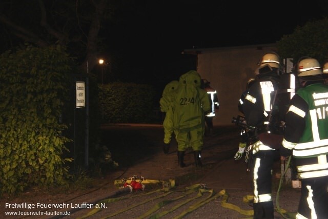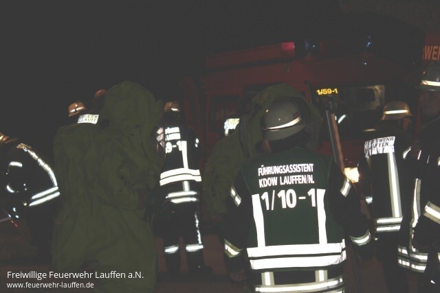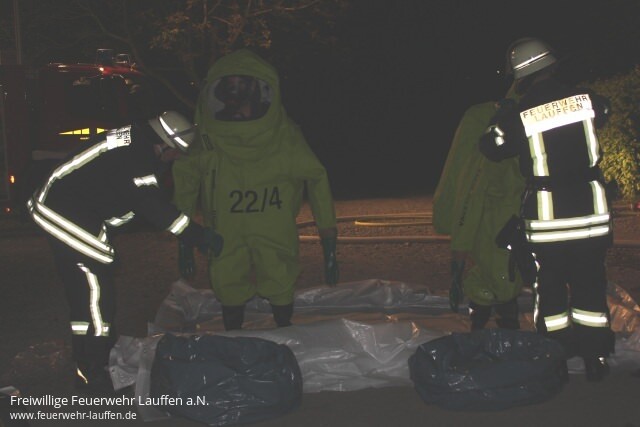 Gegen 22 Uhr wurde die Feuerwehr Lauffen mit Vollalarm und der Gruppe Umweltschutz und Meßtechnik mit dem Einsatzstichwort "Gefahrguteinsatz Freibad Lauffen" alarmiert, weil die dortige Anlage einen Chlorgasaustritt angezeigt hatte.