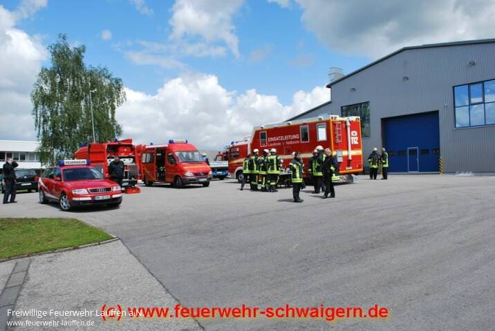 Gleichzeitig wurde im Hof der benachbarten Firma Kempe die Einsatzleitung mit dem ELW2 des Landkreises aufgebaut. Dort wurde auch der GW-Mess der Feuerwehr Lauffen stationiert. Einsatzleiter Jürgen Kachel wurde von Kreisbrandmeister Uwe Vogel und dessen Stellvertreter Heiner Schiefer unterstützt.